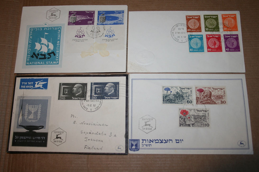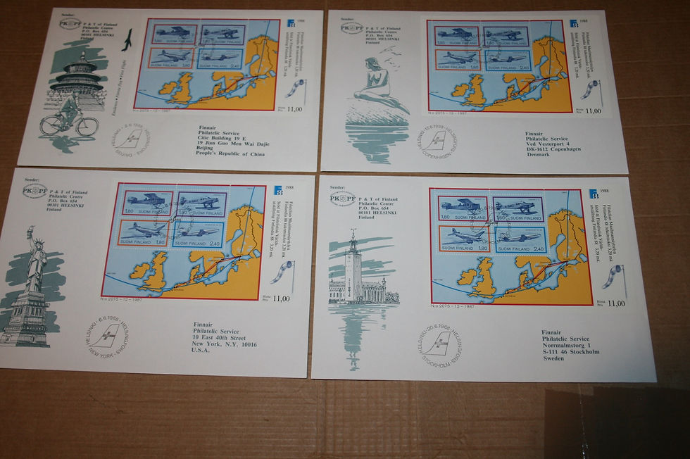 Lisäksi postikortteja, FDC ensipäivä- ja erikoisleimakuoria ja muuta alaan liittyvää. Haku maan, taiteilijan tai aiheen mukaan. Kuntoluokitus K1-5, xx= käyttämätön